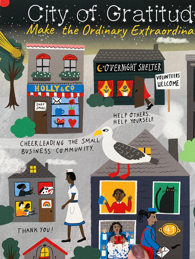 As an example, here we illustrated a bespoke house for Holly & Co's shopfront. But anything on the map can be adapted and changed.
